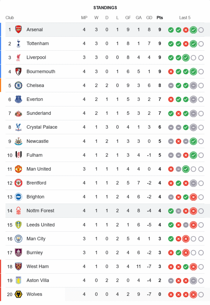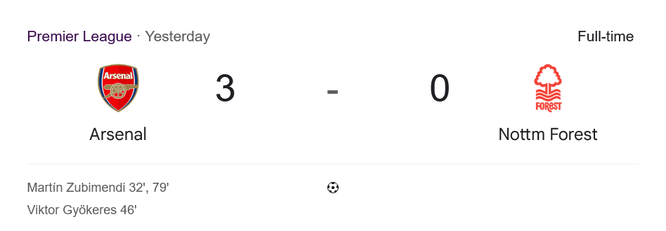 ชัยชนะนี้ทำให้ อาร์เซนอล เก็บเพิ่มเป็น 9 คะแนน จาก 4 นัด ยิงได้ 9 เสียเพียง 1 ประตู รั้งอันดับ 1 ร่วมกับ สเปอร์ส, ลิเวอร์พูล และบอร์นมัธ แต่ลูกได้เสียดีกว่า ส่วน น็อตติ้งแฮม ฟอเรสต์ หล่นไปอยู่อันดับ 14 มีเพียง 4 คะแนนจาก 4 นัด สถานการณ์เริ่มน่าห่วงหากไม่เร่งคืนฟอร์ม