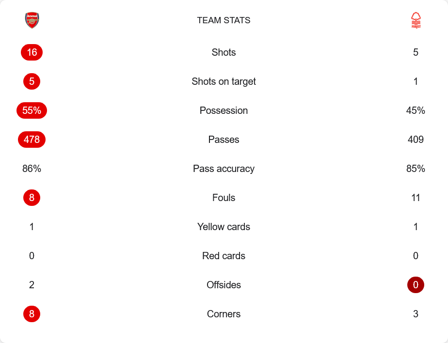 อาร์เซนอลเหนือกว่าชัดเจน ครองบอล 55% ยิงทั้งหมด 16 ครั้ง เข้ากรอบ 5 ประตู ส่วนฟอเรสต์มีโอกาสเพียง 5 ครั้ง เข้ากรอบเพียง 1 การผ่านบอลของเจ้าถิ่น 478 ครั้ง ความแม่นยำ 86% สูงกว่าฟอเรสต์ที่จ่าย 409 ครั้ง ความแม่นยำ 85% แม้จะใกล้เคียง แต่คุณภาพในการสร้างสรรค์โอกาสและความคมต่างกันลิบลับ