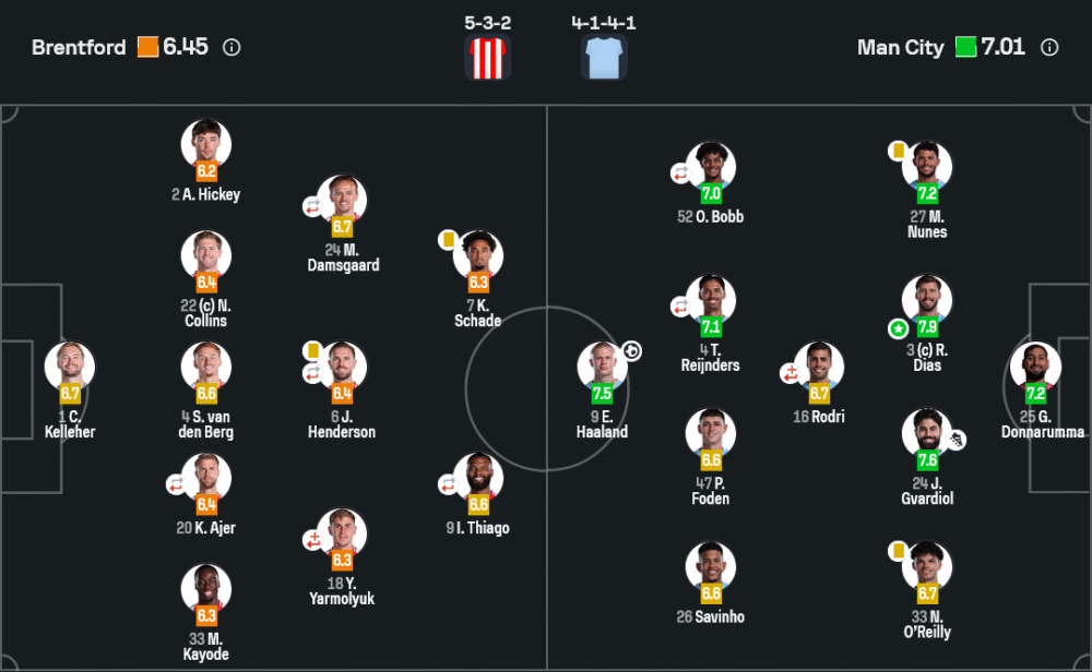 เกมนี้ แมนเชสเตอร์ ซิตี้ ใช้ระบบ 4-1-4-1 เน้นครองบอลและคุมจังหวะกลางสนามโดย โรดรี คอยตัดเกมและเชื่อมระหว่างแนวรับกับแนวรุก ส่วนเกมรุกอาศัยความเฉียบขาดของ ฮาแลนด์ และความเร็วจากริมเส้น บ็อบบ์ และ ซาวินโญ่ ที่ทำให้แนวรับเบรนท์ฟอร์ดต้องถอยลึกตลอด