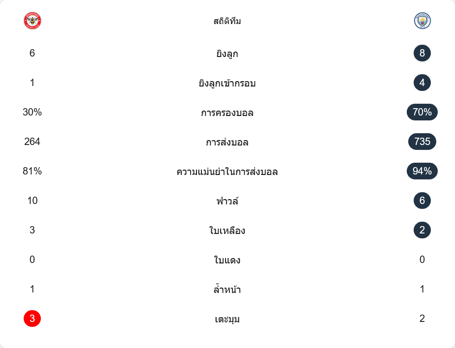 แมนฯ ซิตี้ ครองบอลเหนือกว่าอย่างชัดเจนถึง 70% ต่อ 30% ของเจ้าบ้าน โดยมีโอกาสยิง 8 ครั้ง เข้ากรอบ 4 ครั้ง ขณะที่เบรนท์ฟอร์ดยิงเพียง 6 ครั้ง เข้ากรอบแค่ 1