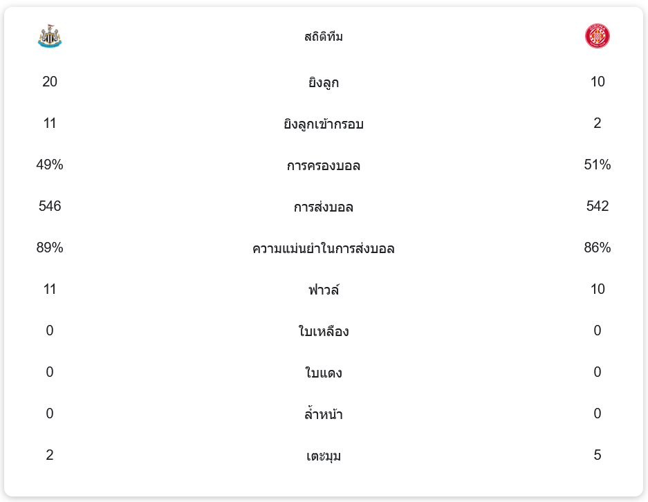 - นิวคาสเซิ่ล ยูไนเต็ด ยิงทั้งหมด 20 ครั้ง เข้ากรอบ 11 ครั้ง ครองบอล 49%