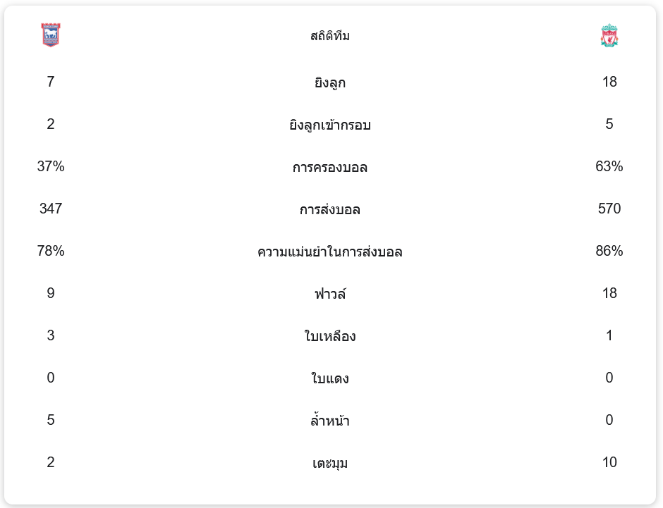 ทางด้าน อิปสวิช ทาวน์ มีการยิงทั้งหมด 7 ครั้ง เข้ากรอบ 2 ครั้ง และครองบอลได้เพียง 37% ด้วยการส่งบอลทั้งหมด 347 ครั้ง ความแม่นยำในการส่งบอลอยู่ที่ 78% พวกเขาทำฟาวล์ทั้งหมด 9 ครั้ง ได้รับใบเหลือง 3 ใบ และไม่มีใบแดง ได้เตะมุม 2 ครั้ง