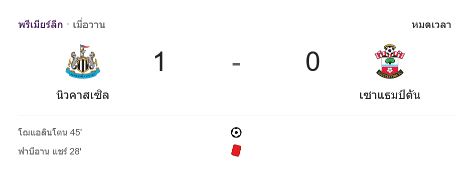 เกมนี้เป็นการต่อสู้ที่ดุเดือดระหว่างทั้งสองทีม โดยในช่วงครึ่งแรก โจเอลินตัน ของ นิวคาสเซิล ยูไนเต็ด ทำประตูสำคัญในนาทีที่ 45 ทำให้ทีมขึ้นนำ 1-0 ขณะที่ เซาแธมป์ตัน ต้องเจอกับปัญหาใหญ่เมื่อ ฟาเบียน แชร์ ถูกใบแดงไล่ออกในนาทีที่ 28 ทำให้เหลือผู้เล่น 10 คน แม้จะครองบอลและสร้างโอกาสมากกว่า แต่ไม่สามารถทำประตูตีเสมอได้ จบเกม นิวคาสเซิล ยูไนเต็ด เก็บชัยชนะไปด้วยสกอร์ 1-0