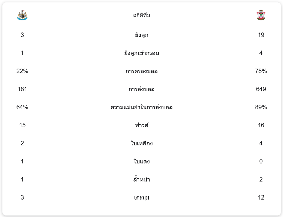 นิวคาสเซิล ยูไนเต็ด มีการยิงทั้งหมด 3 ครั้ง เข้ากรอบ 1 ครั้ง และครองบอลได้เพียง 22% ด้วยการส่งบอลทั้งหมด 181 ครั้ง ความแม่นยำในการส่งบอลอยู่ที่ 64% พวกเขาทำฟาวล์ทั้งหมด 15 ครั้ง ได้รับใบเหลือง 2 ใบ และใบแดง 1 ใบ ได้เตะมุม 3 ครั้ง