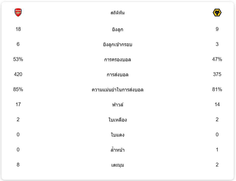 อาร์เซนอล มีการยิงทั้งหมด 18 ครั้ง เข้ากรอบ 6 ครั้ง และครองบอลได้ 53% ด้วยการส่งบอลทั้งหมด 420 ครั้ง ความแม่นยำในการส่งบอลอยู่ที่ 85% พวกเขาทำฟาวล์ทั้งหมด 17 ครั้ง ได้รับใบเหลือง 2 ใบ และไม่มีใบแดง ได้เตะมุม 8 ครั้ง