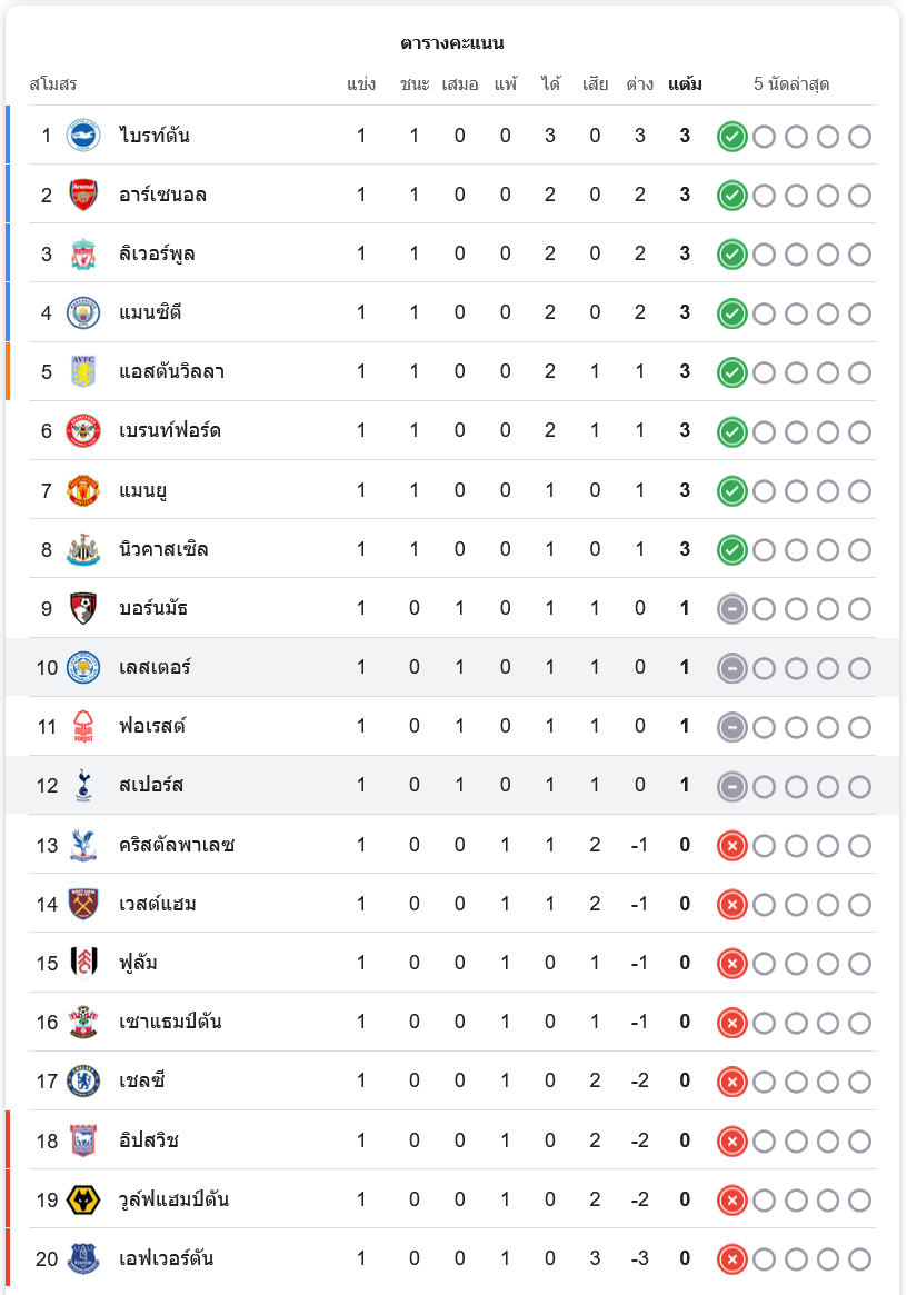 ผลเสมอในนัดนี้ทำให้ เลสเตอร์ ซิตี้ รั้งอยู่ในอันดับที่ 10 ของตาราง พรีเมียร์ลีก 2024 โดยมี 1 คะแนนจากการแข่ง 1 นัด ขณะที่ ท็อตแน่ม ฮ็อทสเปอร์ อยู่ในอันดับที่ 12 ด้วยคะแนนเท่ากัน ซึ่งทั้งสองทีมยังต้องเร่งทำผลงานให้ดีขึ้นในนัดต่อไปเพื่อไต่อันดับขึ้นมา