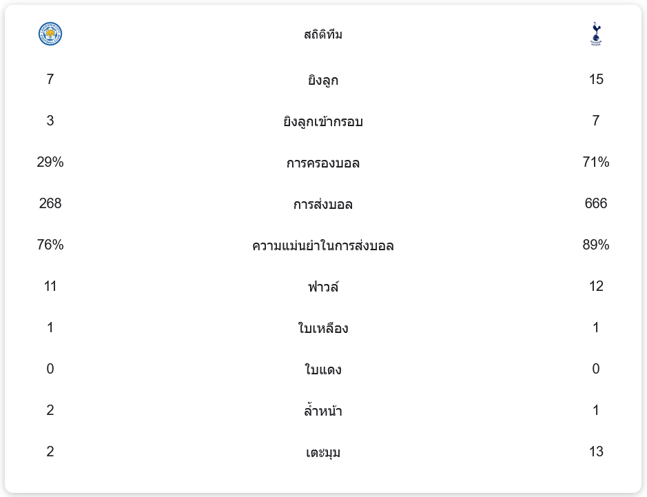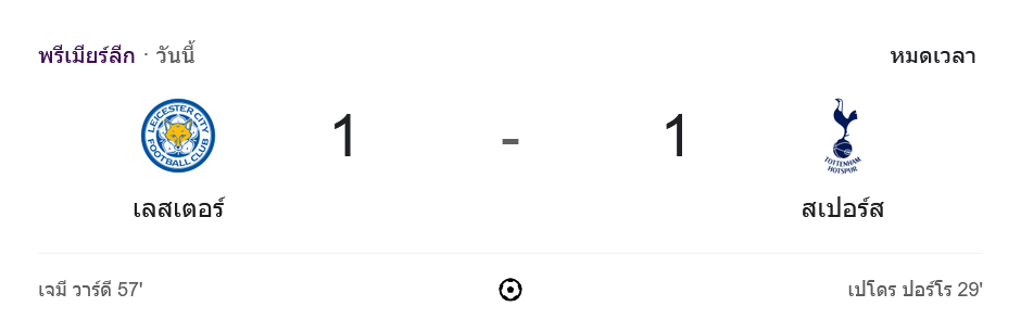 การแข่งขัน พรีเมียร์ลีก 2024 เมื่อคืนที่ผ่านมาเป็นการพบกันระหว่าง เลสเตอร์ ซิตี้ และ ท็อตแน่ม ฮ็อทสเปอร์ ที่สนามคิงพาวเวอร์สเตเดียม จบลงด้วยผลเสมอ 1-1 ซึ่งทั้งสองทีมต่างมีโอกาสที่ดีและสร้างความตื่นเต้นให้กับแฟนบอลที่ติดตามอยู่ทั่วโลก