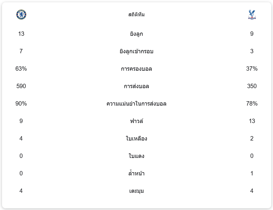 สถิติการแข่งขัน แสดงให้เห็นว่าเชลซีครองบอลได้มากถึง 63% และมีการส่งบอล 590 ครั้งเทียบกับคริสตัล พาเลซที่ครองบอลได้เพียง 37% และส่งบอล 350 ครั้ง เชลซียังมีโอกาสยิงทั้งหมด 13 ครั้ง เข้ากรอบ 7 ครั้ง ขณะที่พาเลซยิง 9 ครั้ง เข้ากรอบ 3 ครั้ง ความแม่นยำในการส่งบอลของเชลซีที่ 90% แสดงให้เห็นถึงการควบคุมเกมที่ดี แต่ยังขาดความเฉียบคมในการทำประตู