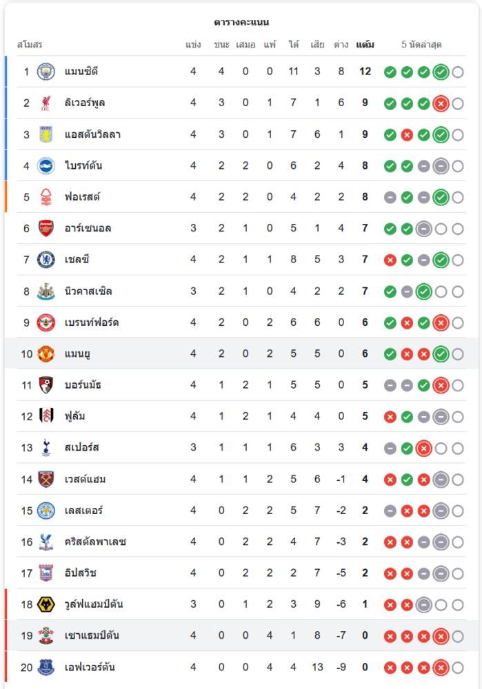 สถานการณ์ในตารางคะแนน: แมนฯ ยูไนเต็ดขยับอันดับขึ้น เซาแธมป์ตันอยู่โซนตกชั้น
