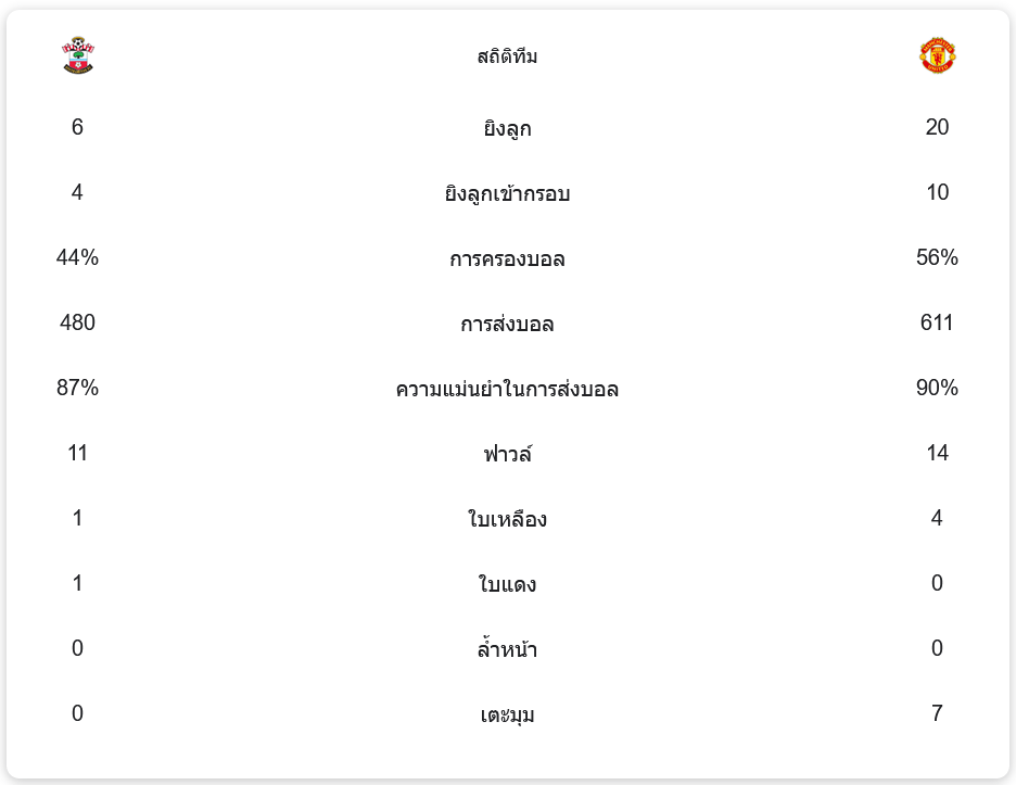 จากสถิติการแข่งขัน แมนเชสเตอร์ ยูไนเต็ด เป็นฝ่ายที่คุมเกมได้มากกว่าอย่างชัดเจน ด้วยการครองบอล 56% และมีการยิงถึง 20 ครั้ง ตรงกรอบ 10 ครั้ง ขณะที่เซาแธมป์ตันมีโอกาสยิงเพียง 6 ครั้งและยิงตรงกรอบ 4 ครั้ง แม้ว่าการส่งบอลของเซาแธมป์ตันจะมีความแม่นยำถึง 87% แต่ก็ไม่เพียงพอที่จะช่วยให้พวกเขาทำประตูได้