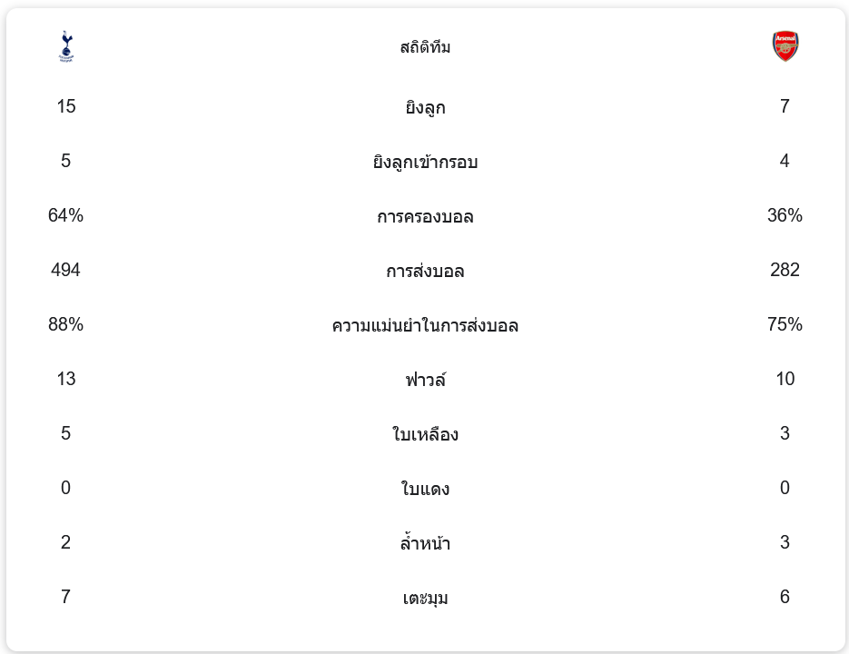 ในเกมนี้ ท็อตแน่ม ฮ็อทสเปอร์ มีโอกาสยิงทั้งหมด 15 ครั้ง โดย 5 ครั้งเข้ากรอบ แต่กลับไม่สามารถทำประตูได้ ส่วนทางด้านอาร์เซนอล มีโอกาสยิงเพียง 7 ครั้ง เข้ากรอบ 4 ครั้งแต่ทำได้ 1 ประตู ทีมเจ้าบ้านมีการครองบอลสูงถึง 64% เทียบกับอาร์เซนอลที่ครองบอลเพียง 36% อย่างไรก็ตาม อาร์เซนอลเน้นเกมรับและการโจมตีที่มีประสิทธิภาพ ส่งผลให้สามารถคว้าชัยชนะไปได้
