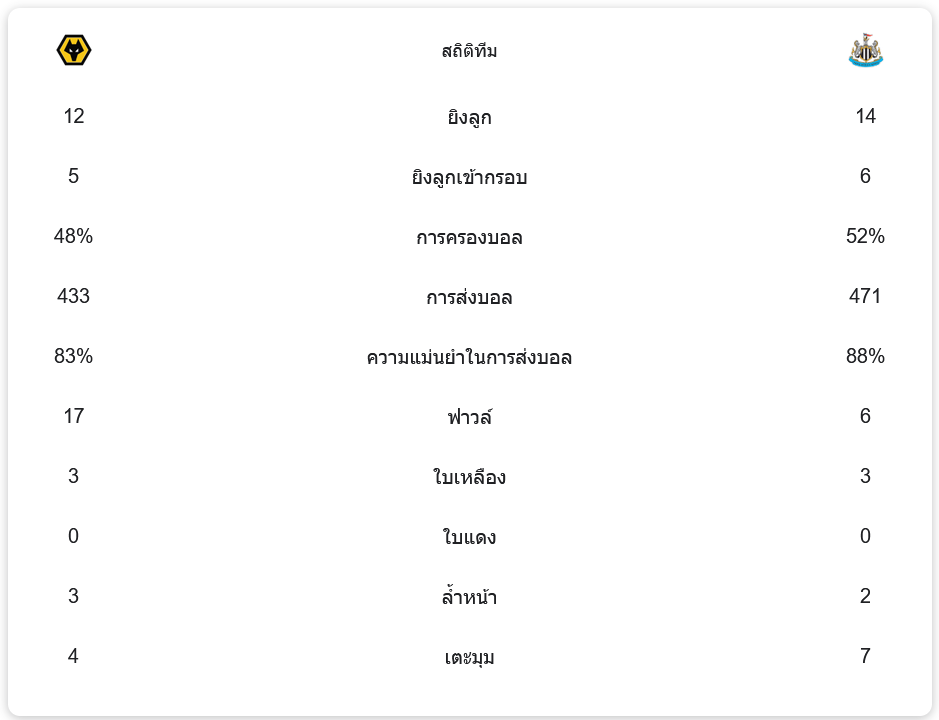 การแข่งขันครั้งนี้นิวคาสเซิ่ลมีการครองบอลมากกว่าเล็กน้อย โดยครองบอลได้ 52% ในขณะที่วูล์ฟแฮมป์ตันครองบอลได้ 48% ทั้งสองทีมมีการยิงทั้งหมด วูล์ฟแฮมป์ตันยิงได้ 12 ครั้ง โดยเข้ากรอบ 5 ครั้ง ส่วนนิวคาสเซิ่ลมีโอกาสยิง 14 ครั้ง โดยเข้ากรอบ 6 ครั้ง นอกจากนี้นิวคาสเซิ่ลยังมีการส่งบอลแม่นยำถึง 88% ในขณะที่วูล์ฟแฮมป์ตันมีความแม่นยำในการส่งบอลที่ 83%