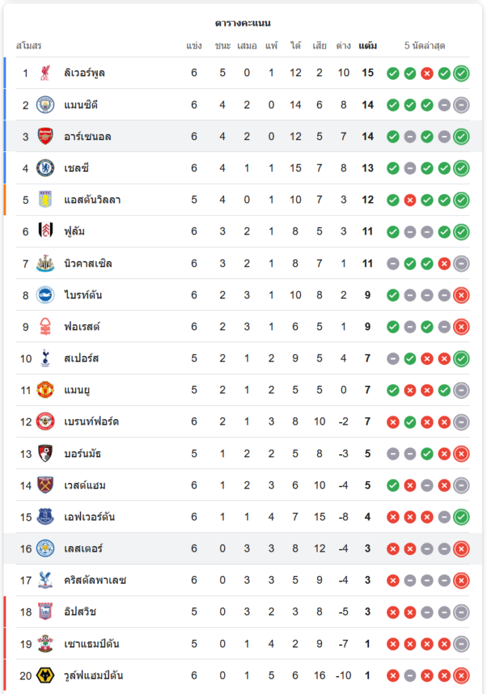 จากชัยชนะนัดนี้ อาร์เซนอล ยังคงอยู่ในอันดับที่ 3 ของตารางพรีเมียร์ลีก 2024 มี 14 คะแนน จาก 6 นัด ส่วน เลสเตอร์ ซิตี้ ยังคงอยู่อันดับที่ 16 มีเพียง 3 คะแนน และต้องพยายามเร่งฟอร์มการเล่นในนัดถัดไป