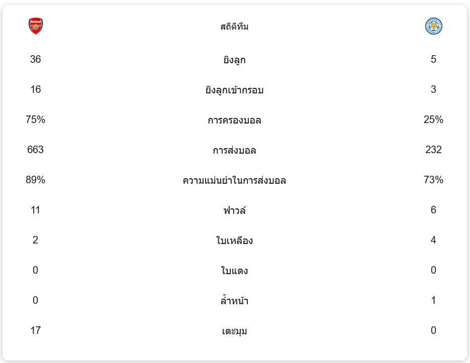 เกมนี้ อาร์เซนอล ครองบอลได้ถึง 75% และยิงได้ถึง 36 ครั้ง โดยเข้ากรอบ 16 ลูก ขณะที่ เลสเตอร์ ซิตี้ ครองบอลเพียง 25% ยิงได้เพียง 5 ครั้ง และเข้ากรอบ 3 ลูก แต่การส่งบอลของอาร์เซนอลทำได้อย่างแม่นยำ ด้วยจำนวนการส่งทั้งหมด 663 ครั้ง และความแม่นยำ 89% นอกจากนี้ยังได้เตะมุมถึง 17 ครั้ง