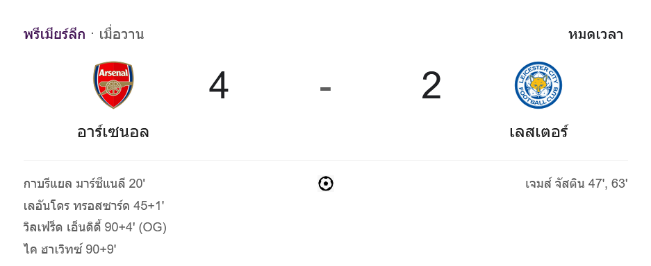 - นาทีที่ 90+4: วิลเฟรด เอ็นดีดี้ ทำเข้าประตูตัวเองให้อาร์เซนอลนำ 3-2