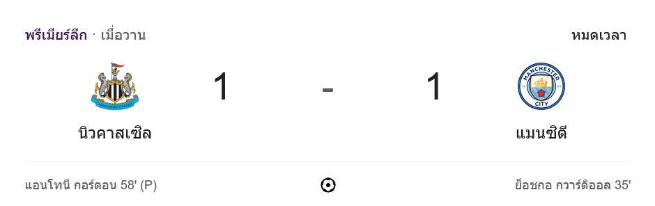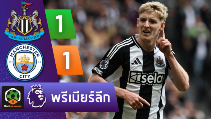 การแข่งขันฟุตบอล พรีเมียร์ลีก 2024 ระหว่าง นิวคาสเซิ่ล ยูไนเต็ด กับ แมนเชสเตอร์ ซิตี้ จบลงด้วยผลเสมอ 1-1 ทั้งสองทีมต่อสู้กันอย่างดุเดือดตลอด 90 นาที โดยฝั่ง แมนเชสเตอร์ ซิตี้ ขึ้นนำก่อนจาก โยชโก้ กวาร์ดิโอล ในนาทีที่ 35 แต่ นิวคาสเซิ่ล สามารถตามตีเสมอได้ในครึ่งหลังจากลูกจุดโทษของ แอนโทนี่ กอร์ดอน ในนาทีที่ 58 ทำให้ทั้งสองทีมแบ่งแต้มกันไปอย่างสุดมันส์