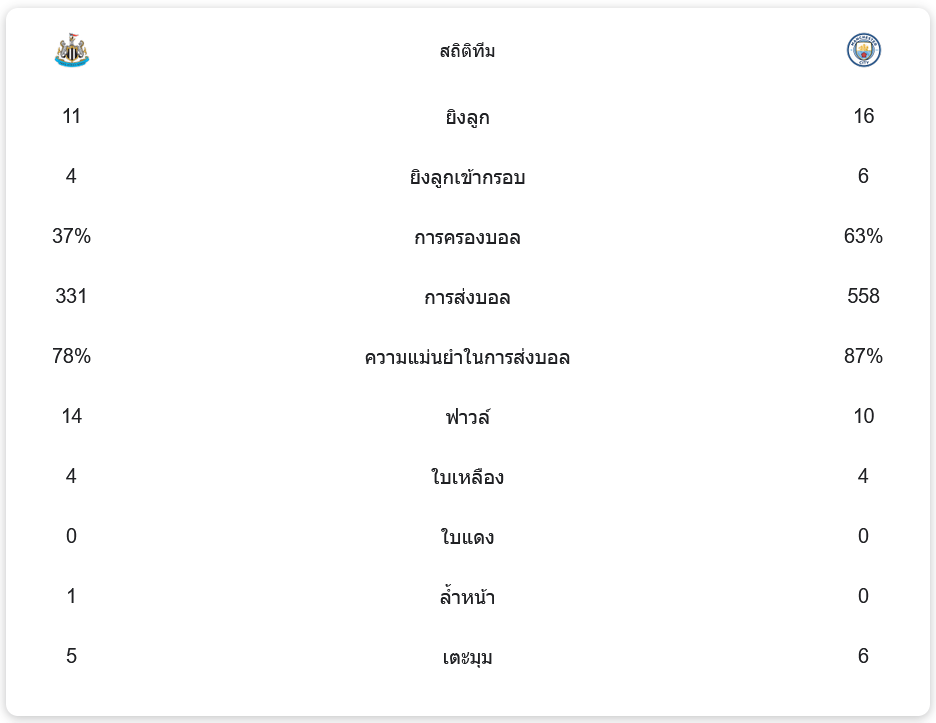 ในเกมนี้ แมนเชสเตอร์ ซิตี้ ครองบอลได้มากถึง 63% และมีการส่งบอลถึง 558 ครั้ง โดยความแม่นยำในการส่งสูงถึง 87% ส่วน นิวคาสเซิ่ล ครองบอลเพียง 37% ส่งบอลทั้งหมด 331 ครั้ง และมีความแม่นยำในการส่ง 78% แมนฯ ซิตี้มีโอกาสยิงมากกว่าที่ 16 ครั้ง แต่ยิงเข้ากรอบเพียง 6 ลูก ขณะที่นิวคาสเซิ่ลยิงได้ 11 ครั้ง และเข้ากรอบ 4 ลูก