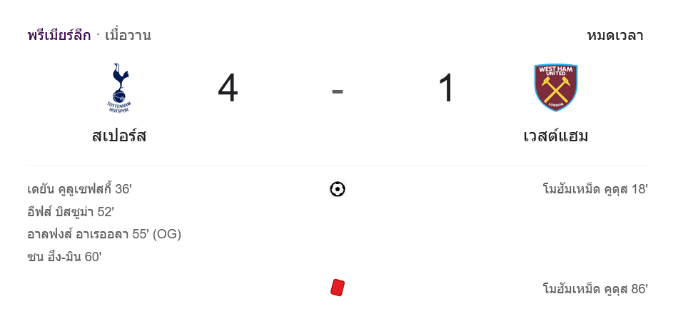 ผลบอลพรีเมียร์ลีก 2024 ระหว่าง ท็อตแน่ม ฮ็อทสเปอร์ 4-1 เวสต์แฮมยูไนเต็ด