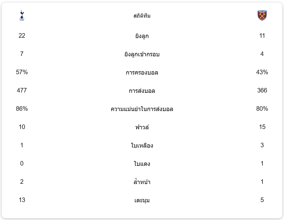สเปอร์สครองเกมได้ดีกว่าที่ 57% ขณะที่เวสต์แฮมมีการครองบอลเพียง 43% นอกจากนี้ สเปอร์สยังมีโอกาสยิงทั้งหมด 22 ครั้ง เข้ากรอบ 7 ครั้ง ในขณะที่เวสต์แฮมมีโอกาสยิงเพียง 11 ครั้ง เข้ากรอบ 4 ครั้ง การส่งบอลของสเปอร์สมีความแม่นยำถึง 86% จากการส่งบอล 477 ครั้ง ส่วนเวสต์แฮมมีการส่งบอล 366 ครั้ง โดยมีความแม่นยำ 80%