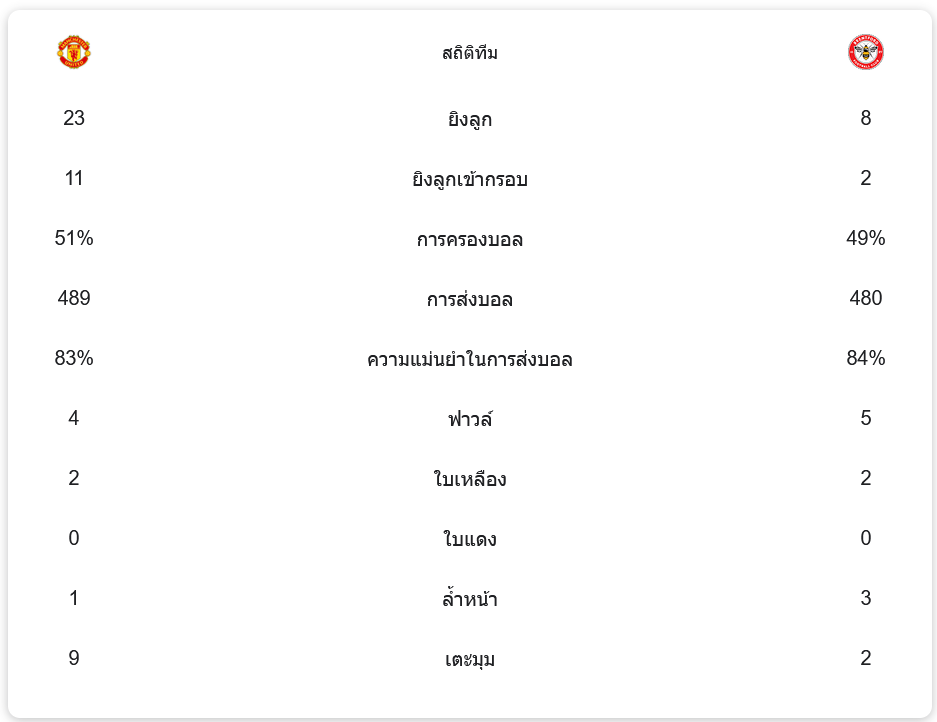 สถิติพรีเมียร์ลีก 2024 ระหว่าง แมนเชสเตอร์ ยูไนเต็ด 2-1 เบรนท์ฟอร์ด