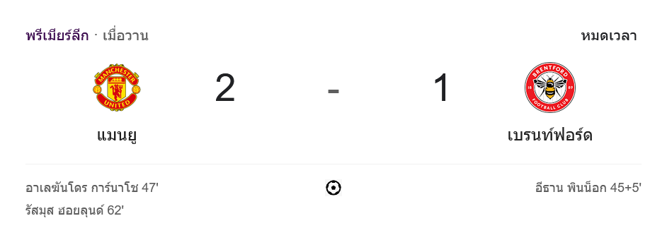 ตารางคะแนนพรีเมียร์ลีก 2024 ระหว่าง แมนเชสเตอร์ ยูไนเต็ด 2-1 เบรนท์ฟอร์ด