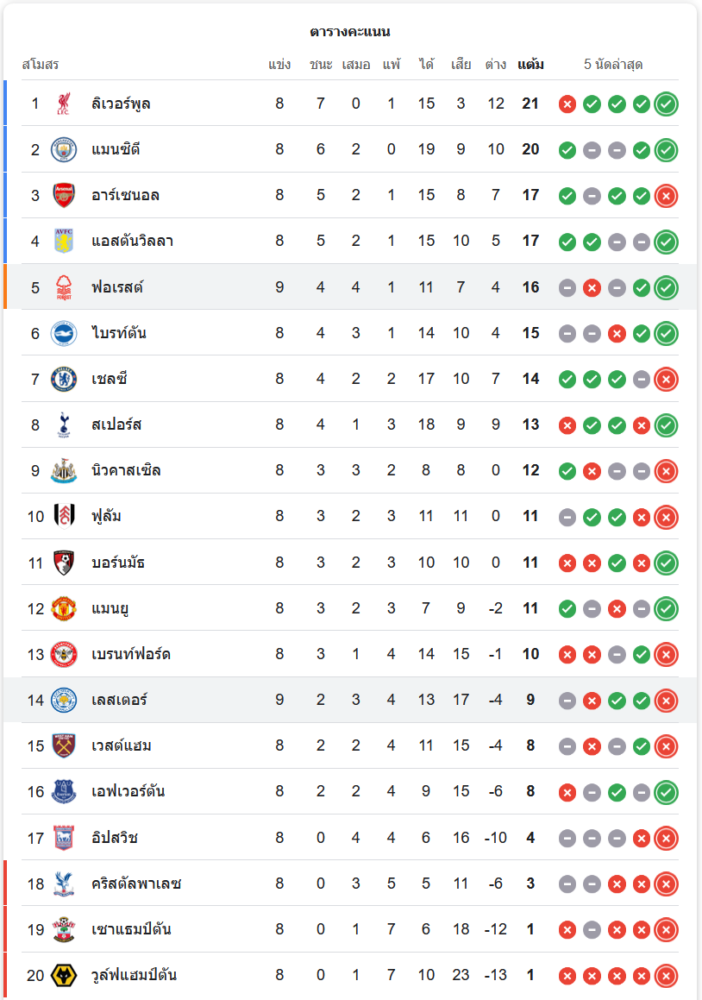 ฟอเรสต์ ขยับขึ้นมาอยู่ในอันดับที่ 5 มี 16 คะแนน จากการลงเล่น 9 นัด ซึ่งเป็นการออกสตาร์ทที่ยอดเยี่ยมสำหรับพวกเขา ในขณะที่ เลสเตอร์ ซิตี้ ต้องเผชิญความท้าทายต่อเนื่องอยู่ในอันดับที่ 14 มีเพียง 9 คะแนน ห่างจากโซนตกชั้นไม่มากนัก