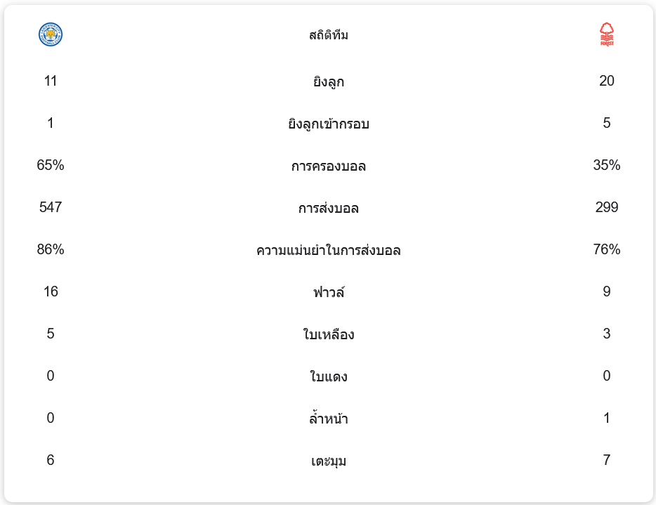 แม้ว่าจะพ่ายแพ้ แต่เลสเตอร์ ซิตี้ยังคงครองบอลได้ถึง 65% เทียบกับฟอเรสต์ที่มีเพียง 35% อย่างไรก็ตาม ฟอเรสต์มีการยิงทั้งหมด 20 ครั้ง มากกว่าเลสเตอร์ ซิตี้ที่มีเพียง 11 ครั้ง แสดงให้เห็นถึงความอันตรายของเกมรุกของฟอเรสต์ในนัดนี้