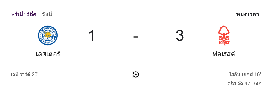 ผลบอลสดพรีเมียร์ลีก 2024 ระหว่าง ทีมเลสเตอร์ ซิตี้ vs ทีมน็อตติ้งแฮม ฟอเรสต์ วันนี้ 26/10/67 ดูบอลย้อนหลัง คลิปไฮไลท์ ดูบอลพรีเมียร์ลีก 2024