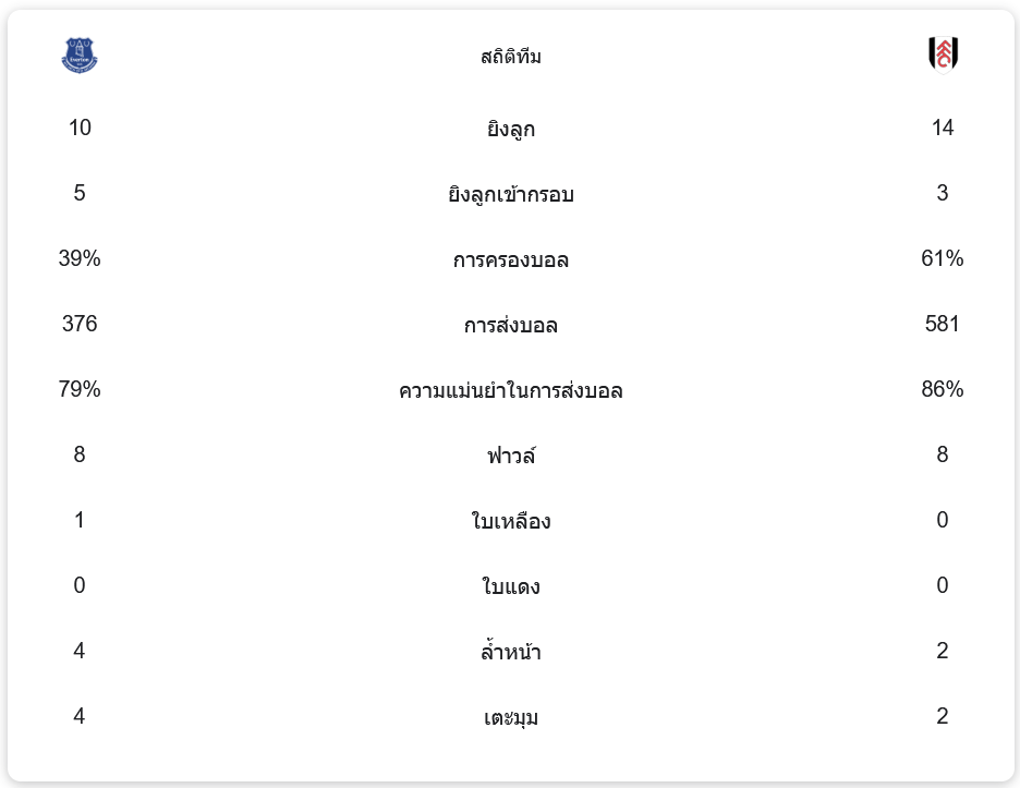 แม้ว่าฟูแล่มจะครองบอลได้มากถึง 61% และสร้างโอกาสยิงถึง 14 ครั้ง ตรงกรอบ 3 ครั้ง แต่เอฟเวอร์ตันก็ยังสู้ได้ดีด้วยการยิงทั้งหมด 10 ครั้ง ตรงกรอบ 5 ครั้ง ความแม่นยำในการส่งบอลของฟูแล่มอยู่ที่ 86% และเอฟเวอร์ตันอยู่ที่ 79% เกมนี้มีการฟาวล์เกิดขึ้นฝั่งละ 8 ครั้ง ใบเหลือง 1 ใบเกิดขึ้นในฝั่งของเอฟเวอร์ตัน