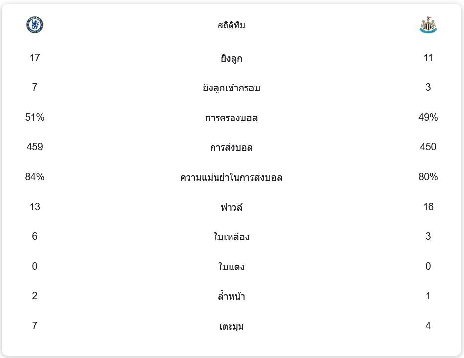 เชลซีมีการครองบอลอยู่ที่ 51% ขณะที่นิวคาสเซิ่ลมี 49% การยิงของเชลซีทำได้มากถึง 17 ครั้ง เข้ากรอบ 7 ครั้ง ขณะที่นิวคาสเซิ่ลยิง 11 ครั้ง เข้ากรอบ 3 ครั้ง ด้านการส่งบอล เชลซีทำได้ถึง 459 ครั้ง โดยมีความแม่นยำ 84% ส่วนการส่งบอลของนิวคาสเซิ่ลอยู่ที่ 450 ครั้งและความแม่นยำ 80% โดยรวมแล้ว ทั้งสองทีมปะทะกันอย่างเข้มข้นและเต็มไปด้วยฟาวล์ โดยเชลซีฟาวล์ 13 ครั้ง และนิวคาสเซิ่ลฟาวล์ 16 ครั้ง