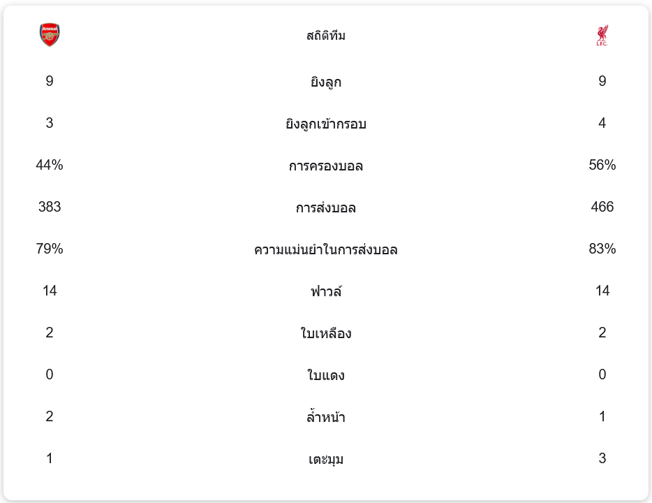 ลิเวอร์พูลครองบอลได้มากกว่าเล็กน้อยที่ 56% ขณะที่อาร์เซนอลครองบอล 44% ทั้งสองทีมยิงทั้งหมด 9 ครั้ง โดยลิเวอร์พูลมีการยิงเข้ากรอบมากกว่าเล็กน้อยที่ 4 ครั้ง ส่วนอาร์เซนอลยิงเข้ากรอบ 3 ครั้ง ความแม่นยำในการส่งบอลของลิเวอร์พูลอยู่ที่ 83% เทียบกับอาร์เซนอลที่มีความแม่นยำ 79% การแข่งขันครั้งนี้ทั้งสองทีมฟาวล์เท่ากันที่ 14 ครั้งและได้รับใบเหลืองคนละ 2 ใบ