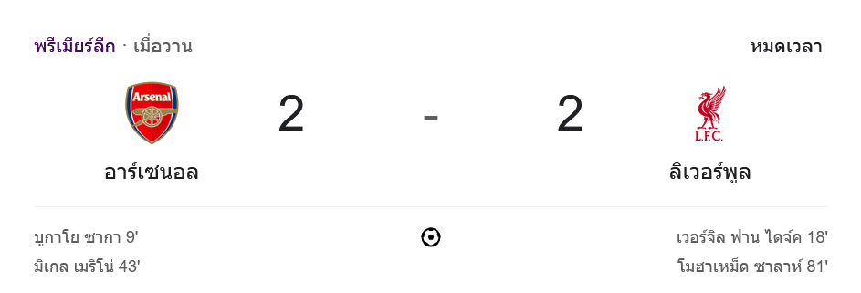 การแข่งขัน พรีเมียร์ลีก 2024 ระหว่าง อาร์เซนอล และ ลิเวอร์พูล จบลงด้วยผลเสมอ 2-2 ที่ทั้งสองทีมแลกกันทำประตูอย่างดุเดือด เกมนี้เป็นเกมที่สร้างความตื่นเต้นให้แฟนบอลอย่างมาก โดยอาร์เซนอลขึ้นนำก่อนแต่ลิเวอร์พูลตามตีเสมอได้ในช่วงท้ายเกม ทำให้จบลงด้วยการแบ่งแต้มไป