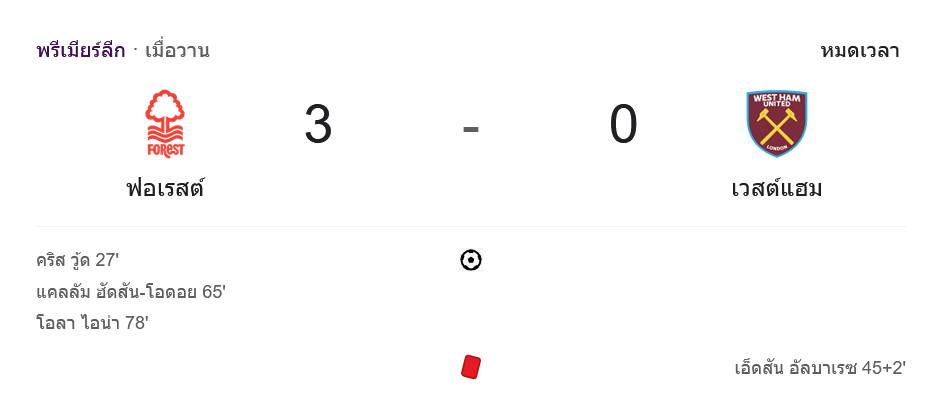 - ⚽ นาทีที่ 27: คริส วูด ยิงให้ ฟอเรสต์ นำ 1-0 (แอสซิสต์โดย อันโตนิโอ โมเรโน)