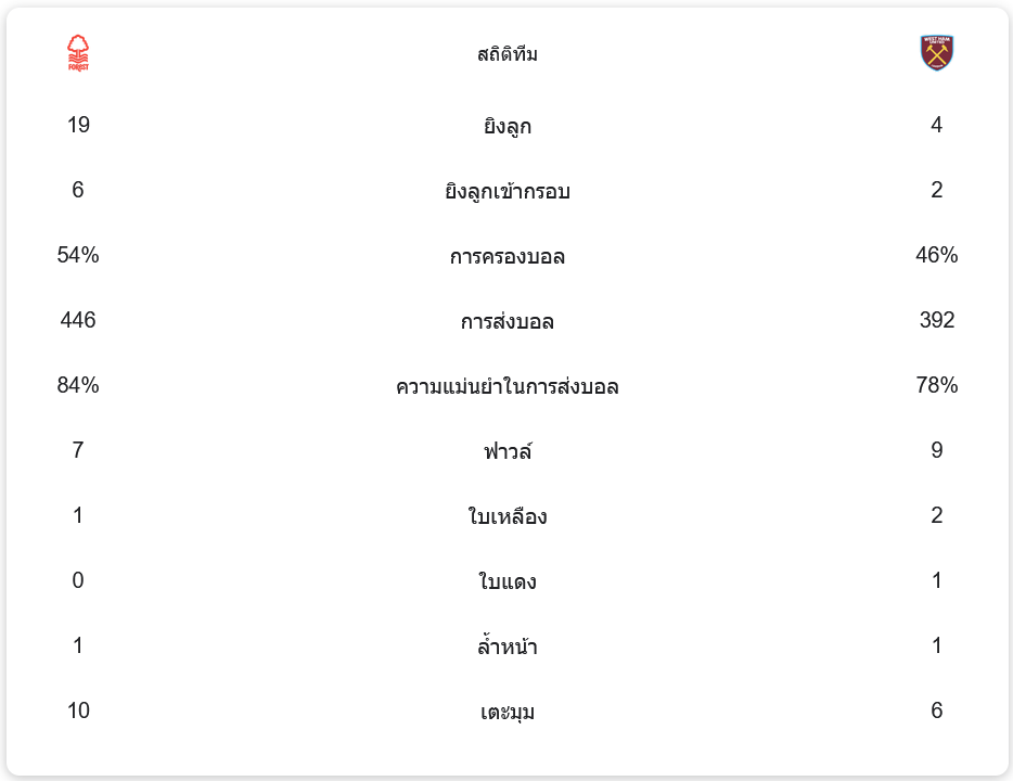 เกมนี้ ฟอเรสต์ มีการครองบอลที่ 54% และส่งบอลได้ทั้งหมด 446 ครั้ง ขณะที่ เวสต์แฮม ครองบอลเพียง 46% และมีการส่งบอล 392 ครั้ง ฟอเรสต์ ยิงทั้งหมด 19 ครั้งและเข้ากรอบ 6 ครั้ง ในขณะที่ เวสต์แฮม ยิงเพียง 4 ครั้งและเข้ากรอบ 2 ครั้ง สถิติการทำฟาวล์อยู่ที่ 7 ครั้งสำหรับ ฟอเรสต์ และ 9 ครั้งสำหรับ เวสต์แฮม โดยทีมเยือนโดนใบเหลือง 2 ใบและใบแดง 1 ใบ