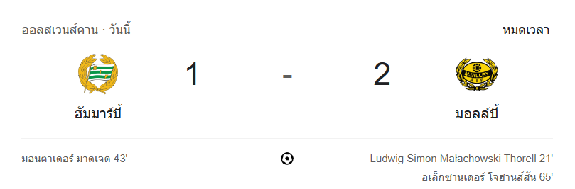 - นาทีที่ 65 (GOAL!): มอลล์บี้พลิกแซง! Alexander Johansson ซัดด้วยซ้ายในกรอบจ่อ ๆ ไม่เหลือ 1-2