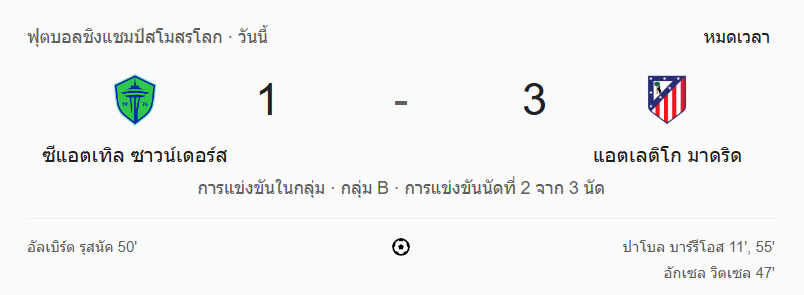 Barrios ทำ 2 ประตู Witsel โหม่งจ่อ ๆ ส่วนซีแอตเทิลได้ Rusnák ยิงตีไข่แตก แต่ต้านพลังเกมรุกตราหมีไม่อยู่ ชัยชนะของ แอตเลติโก้ มาดริด นัดนี้ทำให้พวกเขาเก็บ 3 แต้มเต็มในกลุ่ม B ขณะที่ซีแอตเทิลแพ้สองนัดรวด โอกาสผ่านเข้ารอบเริ่มริบหรี่ โดยเกมนี้ บาร์ริออส ทำสองประตู ส่วนซีแอตเทิลพยายามสู้เต็มที่แต่ความเด็ดขาดยังเป็นรอง