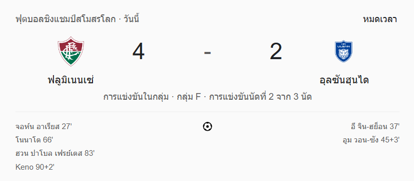 - จบเกม: ฟลูมิเนนเซ่เปิดบ้านเอาชนะ Ulsan HD 4-2 ในเกมที่บุกใส่กันสนุกสุด ๆ มีจังหวะสำคัญเยอะตลอดเกม เจ้าถิ่นคมกว่าในช่วงท้ายเกมคว้า 3 แต้มเต็ม!