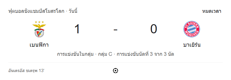 - หมดเวลา: เบนฟิกา 1-0 บาเยิร์น มิวนิค เบนฟิกาต้านเกมรุกสุดกดดันของบาเยิร์นไว้ได้ ตุน 3 แต้มสำคัญในบ้าน!