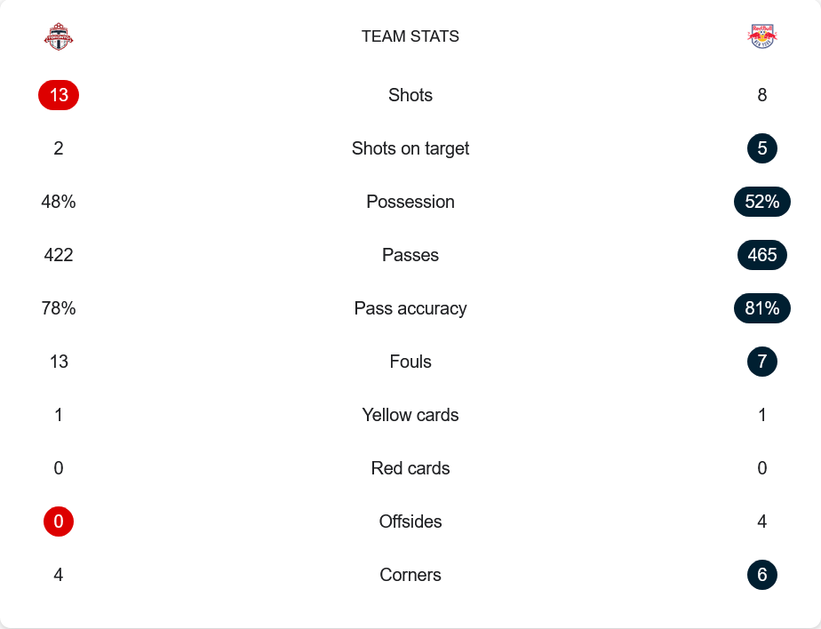 แม้โตรอนโต้จะครองบอลเพียง 48% แต่พวกเขายิงถึง 13 ครั้ง มากกว่าเร้ด บูลล์สที่มีแค่ 8 ครั้ง แต่กลับยิงตรงกรอบเพียง 2 ครั้งเท่านั้น ขณะที่เร้ด บูลล์สยิงตรงกรอบถึง 5 ครั้งจาก 8 โอกาส ข้อมูลสะท้อนให้เห็นถึงปัญหาในการจบสกอร์ของเจ้าถิ่น ทีมเยือนจ่ายบอลแม่นยำกว่า (81% ต่อ 78%) และได้ลูกเตะมุมถึง 6 ครั้ง เทียบกับโตรอนโต้ที่ได้ 4 ครั้ง ฟาวล์ทั้งสองฝั่งสูสีกัน แต่โตรอนโต้มีผู้เล่นล้ำหน้า 0 ครั้งเทียบกับเร้ด บูลล์สที่โดนจับถึง 4 ครั้ง