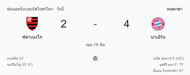- หมดเวลา:ฟลาเมงโก 2-4 บาเยิร์น มิวนิค บาเยิร์นเฉียบคมกว่าในจังหวะสำคัญ เข้ารอบ 8 ทีมแบบสุดมัน!