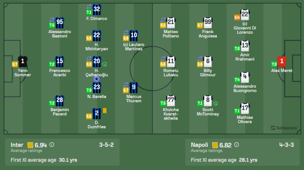 • กองหน้า: ควิชา ควารัตสเคเลีย (7.5), โรเมลู ลูกากู (6.6)