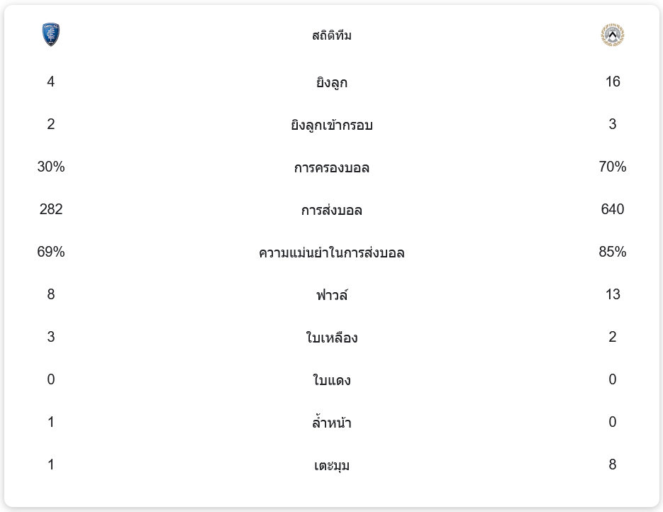 อูดิเนเซ่ครองบอลมากถึง 70% และมีโอกาสยิง 16 ครั้ง โดยเข้ากรอบ 3 ครั้ง ส่วนเอ็มโปลีได้ยิงเพียง 4 ครั้ง แต่เข้ากรอบถึง 2 ครั้ง ความแม่นยำในการส่งบอลของอูดิเนเซ่สูงถึง 85% เหนือกว่าเอ็มโปลีที่ทำได้เพียง 69% อย่างชัดเจน