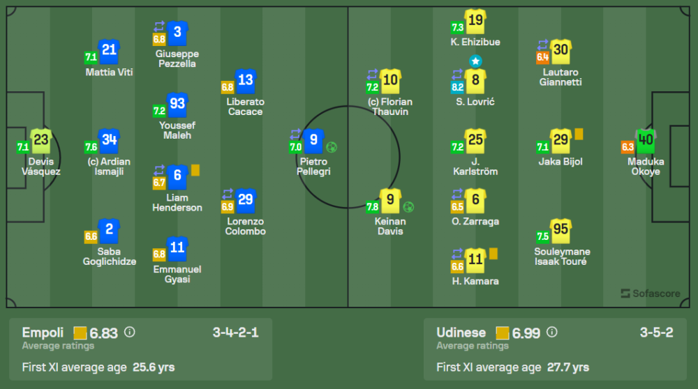 เอ็มโปลีใช้ระบบ 3-4-2-1 ซึ่งเน้นการตั้งรับลึกและสวนกลับเร็ว แต่ยังขาดความต่อเนื่องในการสร้างโอกาสบุก ขณะที่อูดิเนเซ่เล่นด้วยระบบ 3-5-2 ที่เน้นครองบอลในแดนกลาง โดยมี ซานดี้ โลฟริค เป็นจุดเชื่อมเกมสำคัญ การบุกของอูดิเนเซ่ดูมีประสิทธิภาพกว่า แต่ความเด็ดขาดยังไม่เพียงพอที่จะคว้าชัย