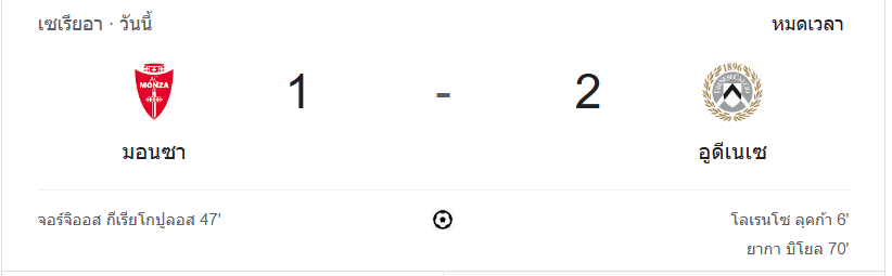 นาทีที่ 97: จบการแข่งขัน อูดิเนเซ่เฉือนชนะมอนซ่า 2-1 คว้าสามแต้มสำคัญในเกมนี้