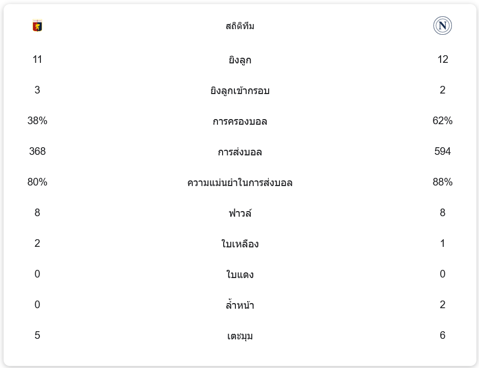 นาโปลีครองบอลเหนือกว่าที่ 62% และสร้างโอกาสยิงได้ 12 ครั้ง เข้ากรอบ 2 ครั้ง ขณะที่เจนัวยิง 11 ครั้ง เข้ากรอบ 3 ครั้ง ความแม่นยำในการส่งบอลของนาโปลีอยู่ที่ 88% ชี้ชัดถึงการควบคุมเกมและคุณภาพของทีม