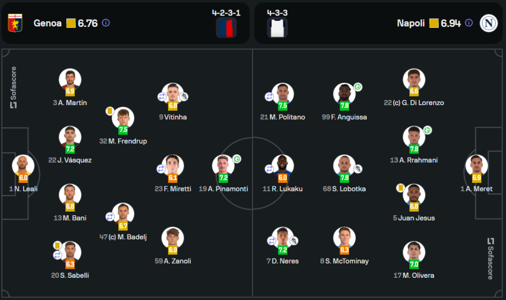 นาโปลีมาในระบบ 4-3-3 ที่เน้นการครองบอลและบุกเป็นหลัก โดยมี ฟร้องค์ อ็องกิสซ่า และ สตานิสลาฟ โลบอตก้า เป็นหัวใจสำคัญในแดนกลาง ทั้งสองคนช่วยเชื่อมเกมและสร้างสรรค์โอกาสให้แนวรุกได้อย่างดี ส่วนเจนัวเลือกใช้ระบบ 4-2-3-1 ที่เน้นการตั้งรับและสวนกลับเร็ว แต่การครองบอลที่ต่ำกว่า (38% เทียบกับ 62%) ทำให้ไม่สามารถสร้างจังหวะบุกที่เด็ดขาดได้เท่านาโปลี
