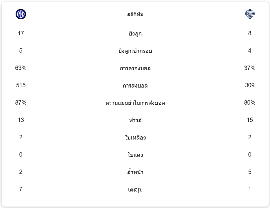 อินเตอร์ มิลานครองบอลถึง 63% และมีโอกาสยิงทั้งหมด 17 ครั้ง โดยเข้ากรอบ 5 ครั้ง ขณะที่โคโมยิงได้เพียง 8 ครั้งและเข้ากรอบ 4 ครั้ง ความแม่นยำในการส่งบอลของอินเตอร์อยู่ที่ 87% เทียบกับโคโมที่ทำได้ 80% โดยเกมนี้มีการทำฟาวล์รวม 28 ครั้ง และใบเหลืองแจกไปทีมละ 2 ใบ