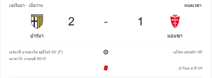 บ้านกีฬา เซเรียอาคืนนี้มีดราม่าสุดมัน เมื่อปาร์ม่าสามารถเฉือนเอาชนะมอนซ่าไปได้ด้วยสกอร์ 2-1 จากประตูชัยในช่วงทดเวลาบาดเจ็บ เกมนี้เต็มไปด้วยจังหวะตื่นเต้นตั้งแต่นาทีแรกจนเสียงนกหวีดสุดท้าย พร้อมทั้งใบแดงที่ส่งผลกระทบอย่างมากต่อเกมของมอนซ่า