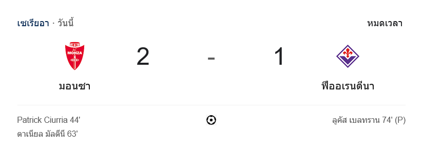การแข่งขันฟุตบอล เซเรียอา 2024 นัดสำคัญในคืนนี้เป็นการพบกันระหว่าง มอนซา และ ฟิออเรนตินา ที่สนามในเมืองมอนซา จบเกมเป็นชัยชนะของเจ้าบ้าน มอนซา ด้วยสกอร์ 2-1 โดยสองประตูสำคัญของเจ้าบ้านมาจาก แพทริค ชูร์เรีย นาทีที่ 44 และ ดาเนียล มัลดินี นาทีที่ 63 ขณะที่ทีมเยือน ฟิออเรนตินา ได้ประตูเดียวจากลูกจุดโทษโดย ลูคัส เบลตราน นาทีที่ 74 ชัยชนะในครั้งนี้ทำให้มอนซาเก็บ 3 แต้มสำคัญ แม้จะยังจมท้ายตารางก็ตาม