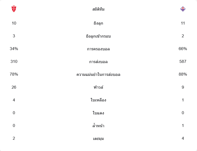 ฟิออเรนตินาเหนือกว่าในแง่การครองบอล (66%) และการผ่านบอลที่แม่นยำ (88%) แต่โอกาสยิงเข้ากรอบกลับน้อยกว่า (2 ครั้ง) เทียบกับมอนซาที่มีโอกาสยิงเข้ากรอบ 3 ครั้ง แม้จะครองบอลเพียง 34% แต่มอนซาแสดงให้เห็นถึงความอันตรายในจังหวะสุดท้าย